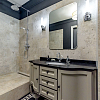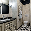 Паркет и двери - инженерная доска из дуба, паркет выложен классическими квадратами - авторский проект. Натуральный мрамор, плитка орнамент ручной работы - метлах, английские обои. На стенах в изголовье кровати выполнено панно из натурального дуба - раскладка французской елки.