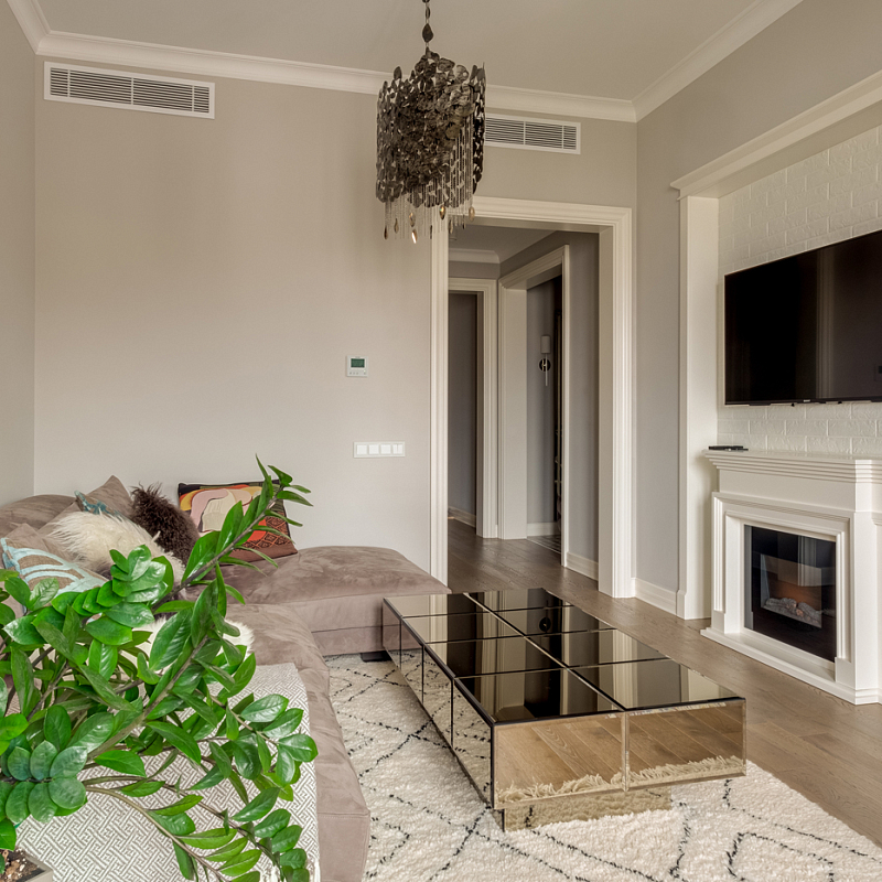 В квартире установлена многоуровневая система очистки воздуха, акустическая система по периметру в потолке, кондиционеры Mitsubishi, приточно-вытяжная вентиляция. Планировка: кухня-гостиная, постирочная, мастер-спальня с санузлом, кабинет, 2 гардеробные, гостевой
