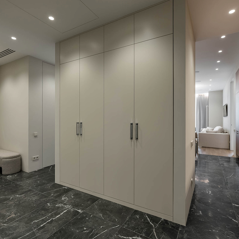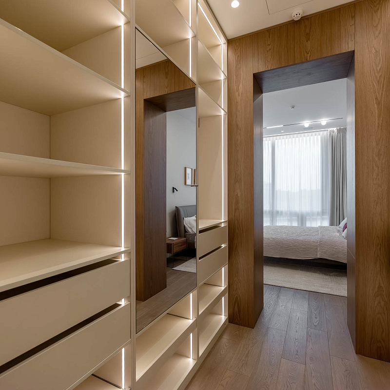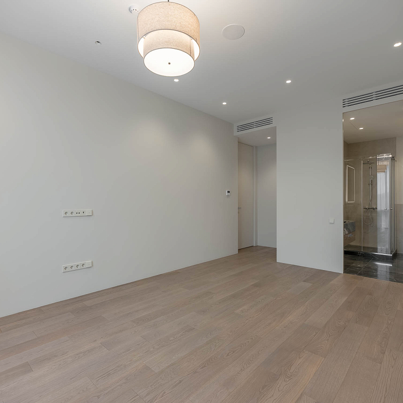 Планировка: гостиная-кухня-столовая с барной зоной (50 м2), 4 спальни с санузлами, гостевой санузел, постирочная и гардеробные комнаты.