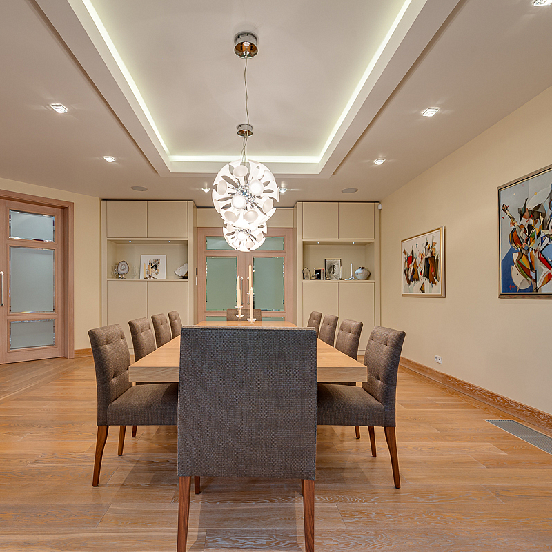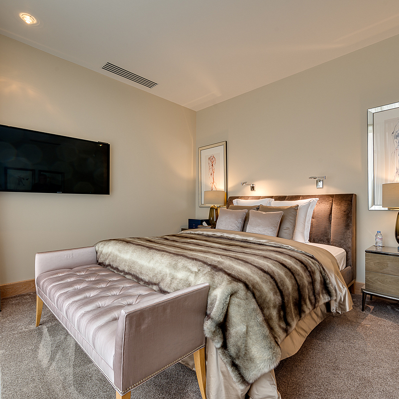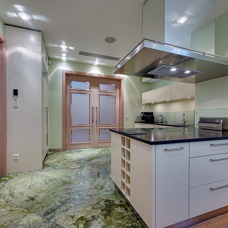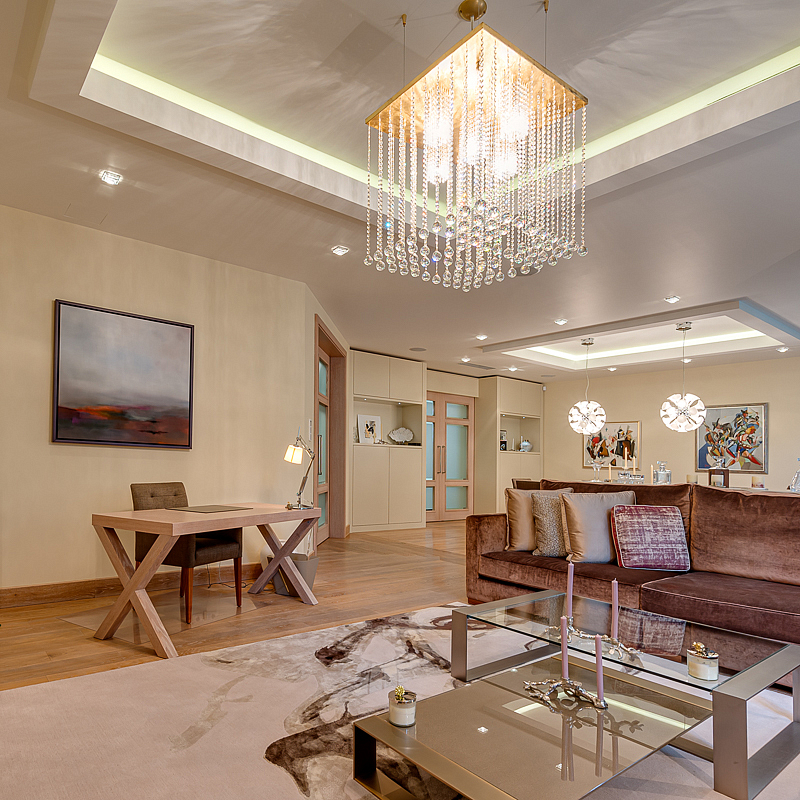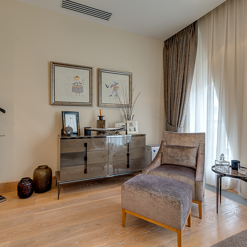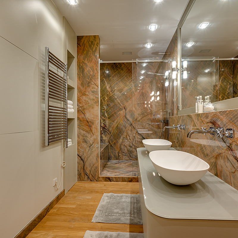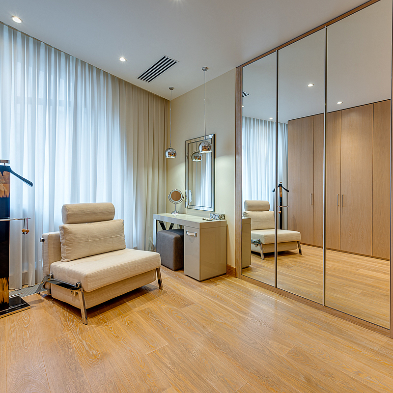 - Приватная зона: две спальни, гардеробная комната с окном, которая может быть переделана в третью спальню. Два санузла с ванной и душевой, отделанные мрамором и ониксом.