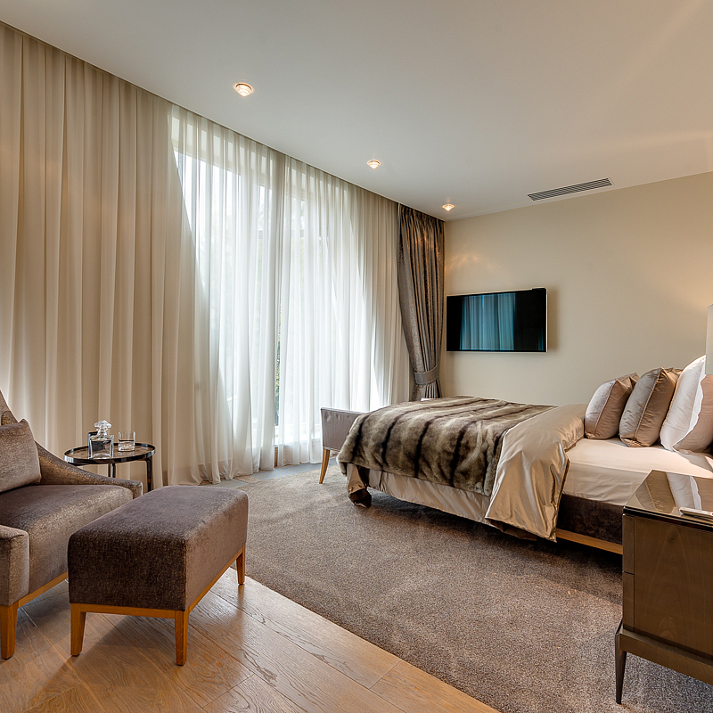 Дизайн-проект выполнен известным Баварским дизайнерским бюро в стиле минимализма с применением дорогостоящих натуральных материалов.