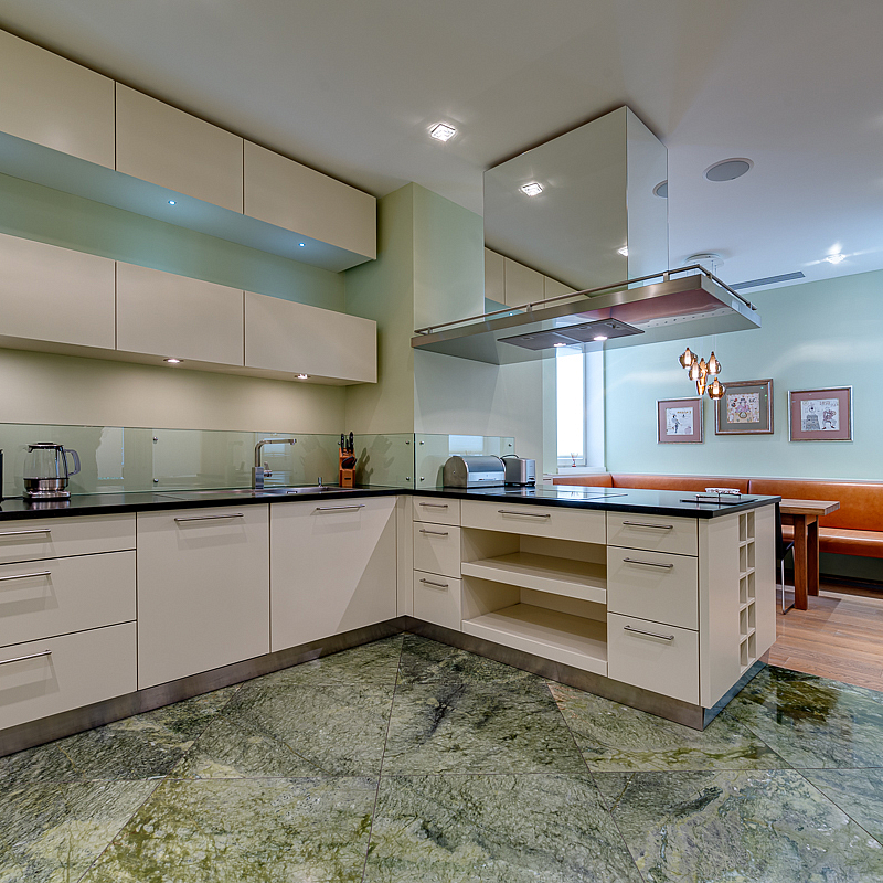 - Гостевая зона: просторная гостиная, кухня 20 м2 с бытовой техникой Gaggenau, столовая зона с прекрасными видами в зеленый двор, гостевой санузел, постирочная.