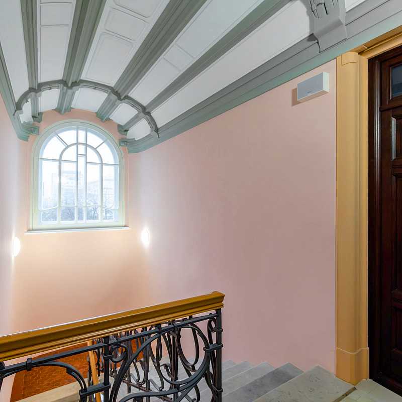 В холлах мраморные лестницы, кованые перила с причудливом узором в стиле модерн, метлахская плитка, арочные своды с лепным узором и витражи.