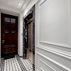 Детально воссозданный исторический интерьер эпохи модерна: штучный паркет, лепнина, высокие распашные двери, метлахская плитка, сантехника Devon&Devon, светильники Ralf Lauren.