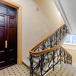 В холлах мраморные лестницы, кованые перила с причудливом узором в стиле модерн, метлахская плитка, арочные своды с лепным узором и витражи.