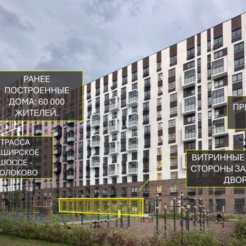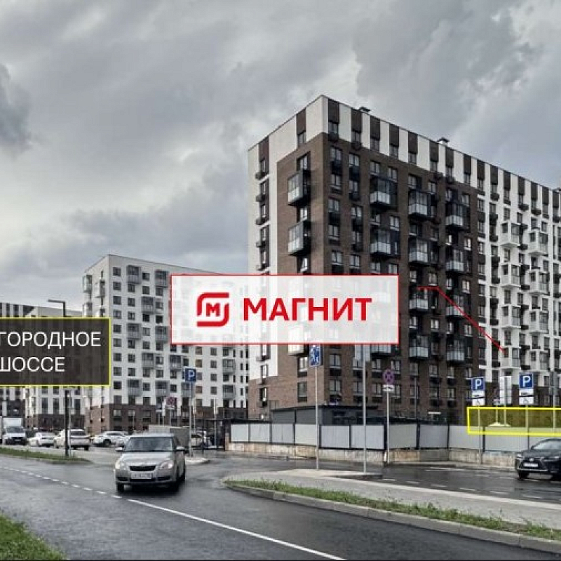 Продажа торговой площади в ЖК «Пригород Лесное» 410 м² с арендатором супермаркет «Магнит». Адрес: МО, г.о. Ленинский, пгт Мисайлово, Пригородное шоссе, 20. Здание переменной этажности 12-17 этажей на 418 квартир. Остановка общественного транспорта в пешей доступности. 60 000 жителей. В 2025 году и перспективой роста численности населения до 180 000.
