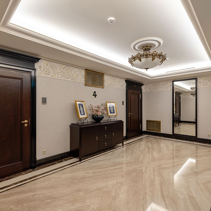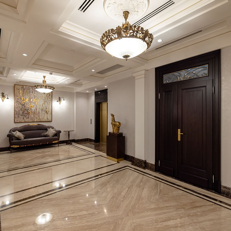 Элементы стиля модерн обретают свою ненавязчивую преемственность и в интерьере внутренних пространств, находя отражение в натуральных материалах отделки, орнаментах и современных колоннах.