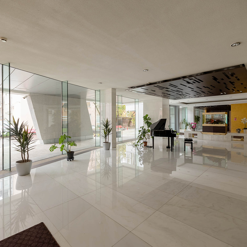 Внешняя и внутренняя отделка дома выполнена с использованием высококачественных материалов: юрский камень, мрамор, гранит, ценные породы дерева. Отличительными особенностями фасада здания являются витражные окна, создающие эффект прозрачности и легкости. В доме расположено 12 квартир.