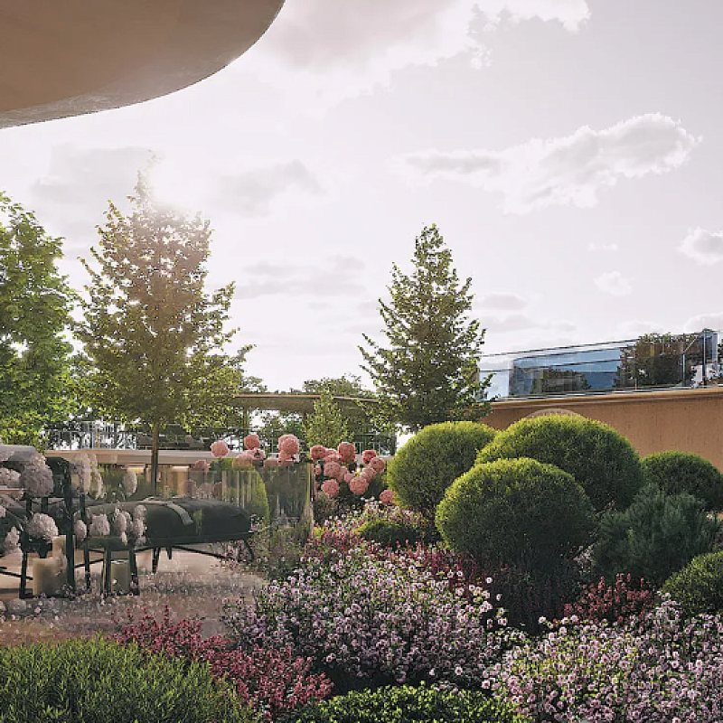 Комплекс располагает закрытым двором площадью 0, 45 га с ландшафтным дизайном, включающим сад с декоративными растениями, зоны отдыха, детские и спортивные площадки. Концепция «двор без машин» обеспечивает безопасность и тишину.