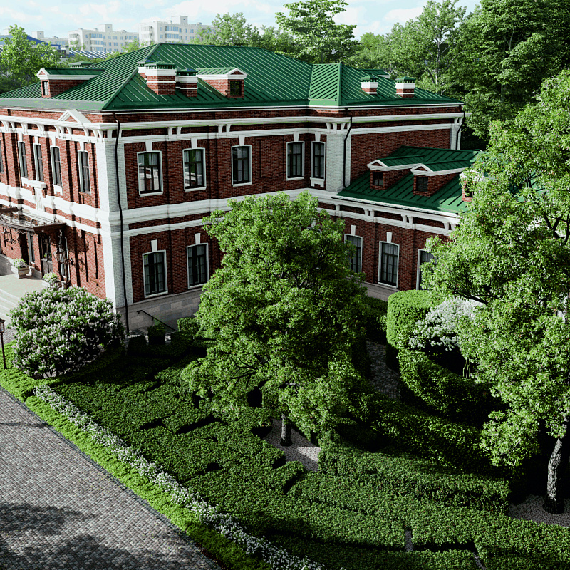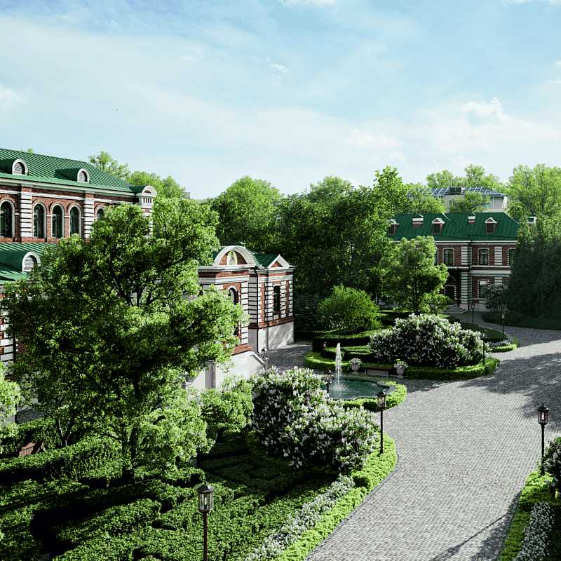 Проект включает четыре исторических особняка общей площадью 4704 кв. м, соединённых подземной галереей, и красивый ландшафтный парк в собственности, который раскинулся на 2 гектарах прилегающей территории. На территории усадьбы разбит собственный ландшафтный парк площадью 2 гектара, где поют соловьи. Как и особняки, он сочетает в себе исторические и современные черты.