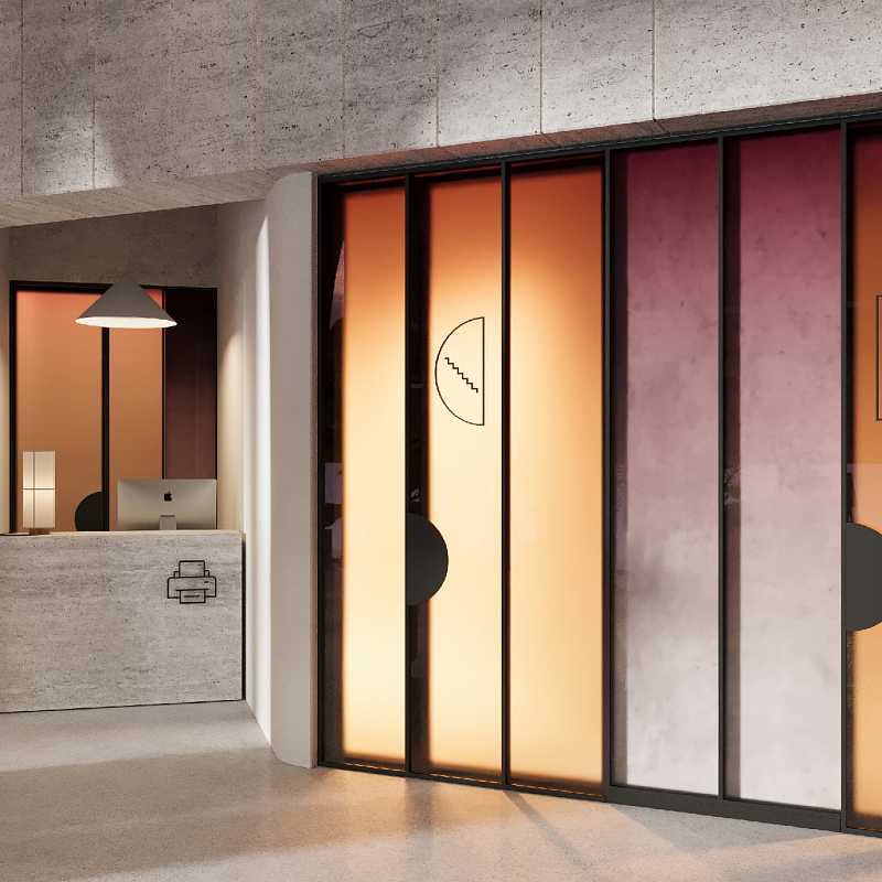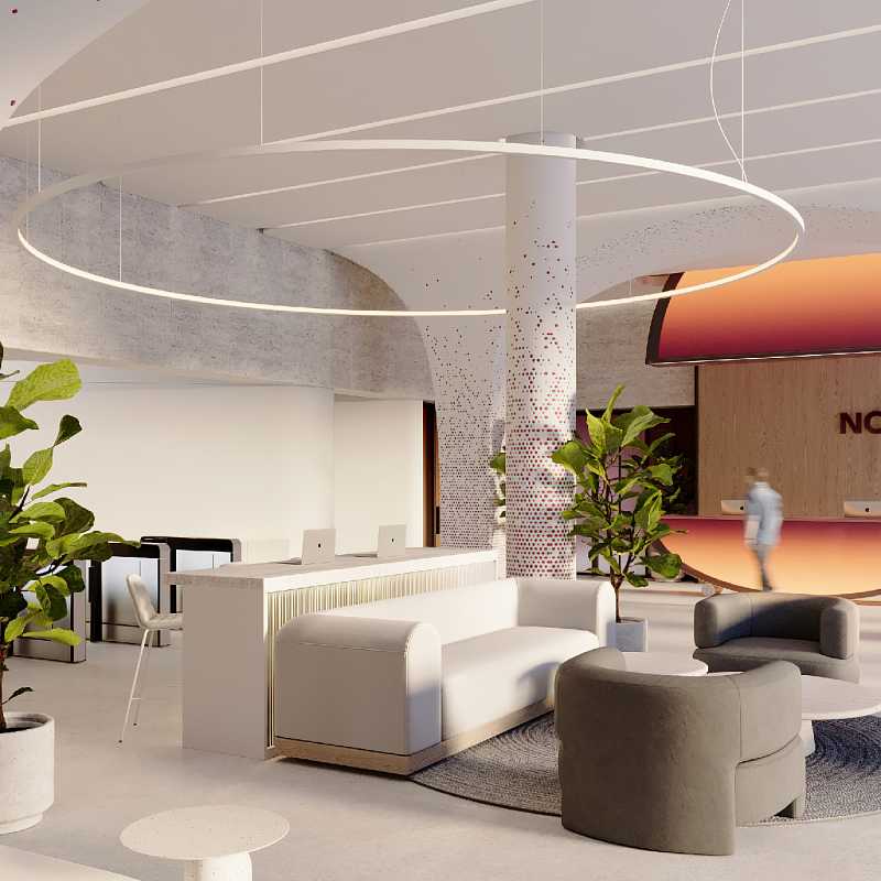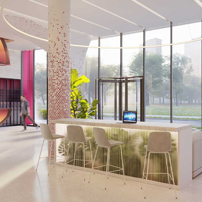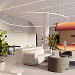 - Современное лобби с потолками 4, 8 м и панорамным остеклением