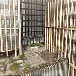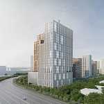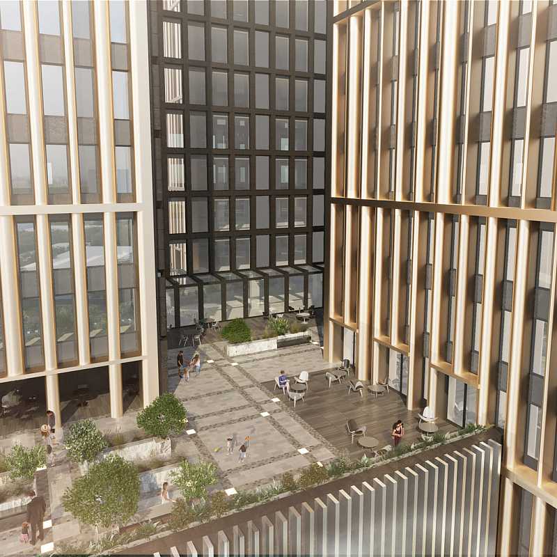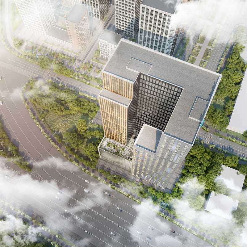 Состоит из многоуровневых объёмов офисной части, объединённых единым 6 этажным стилобатом и подземным этажом.