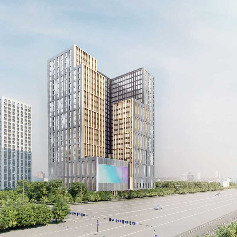 Многоэтажный многофункциональный офисно-торговый центр со встроенной автостоянкой.
