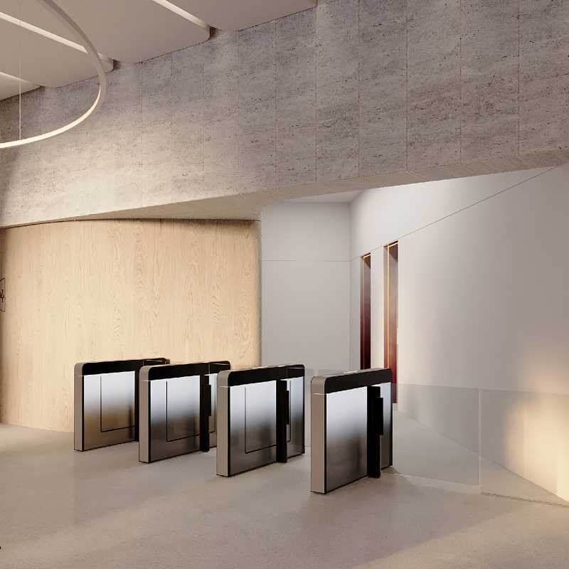 - Современное лобби с потолками 4, 8 м и панорамным остеклением
