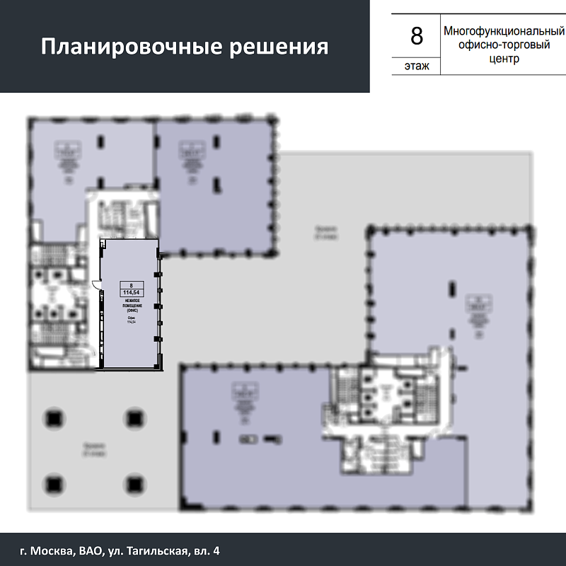 Многоэтажный многофункциональный офисно-торговый центр со встроенной автостоянкой.