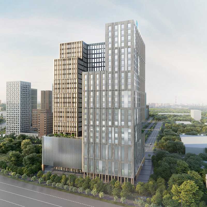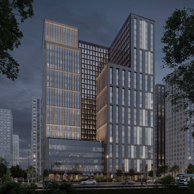 Состоит из многоуровневых объёмов офисной части, объединённых единым 6 этажным стилобатом и подземным этажом.