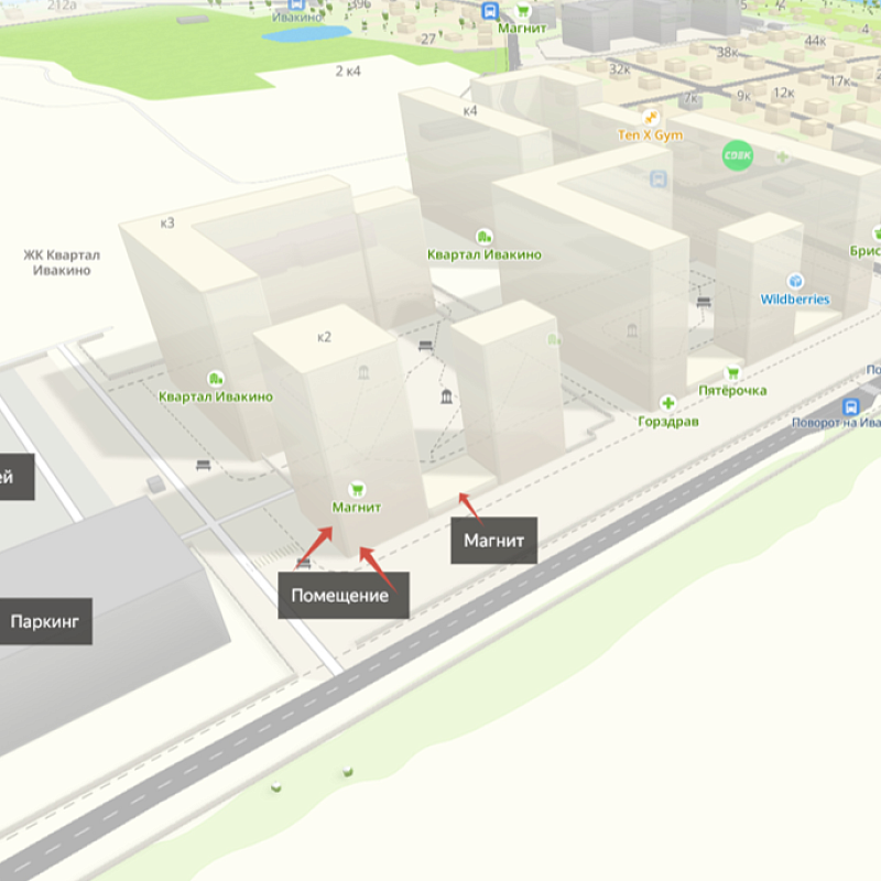 Продажа помещения свободного назначения по адресу квартал Ивакино, к2, мкр. Клязьма-Старбеево, Химки, Московская область. Соседство - супермаркет Магнит. Помещение расположено в стилобатной части дома, на первой линии Олимпийской ул., напротив основной паркинг жилого комплекса. Первая очередь ЖК состоит из четырех 17 этажных корпусов, 2289 квартир.Высокий пешеходный и автомобильный трафик.